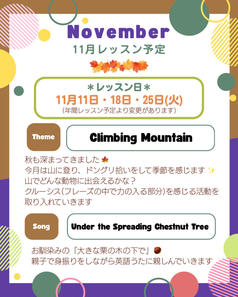 お馴染みの「大きな栗の木の下で」を英語で歌い、 親子で楽しく身振りをつけながら英語のリズムに親しみます🌳✨